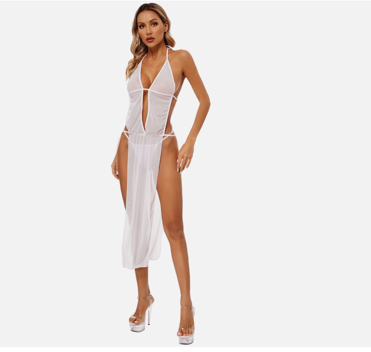 White Plunging Neck Sheer Mesh Slit Maxi Gown